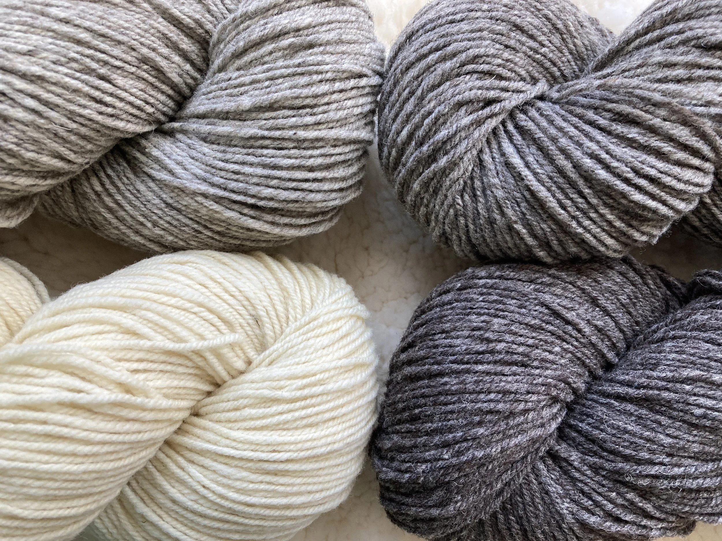 After years of making this fun fingering weight yarn, we sometimes end up with “loner” skeins of Mohonk Light. These can be test colors or odd lots, some have a knot or two but all are full skeins of 550yds/4oz. Jill has gathered these into groups of 5 for shawls, blankets, stripey sweaters or colorwork. None of the skeins are labeled & there is no colorway info available. If you need more than 5 colors or 2750 yds we’d be happy to suggest a color or two to add from the regular Mohonk Light line. These skeins can be from different year’s wool clips so you may notice a slight textural difference between skeins in the same group.